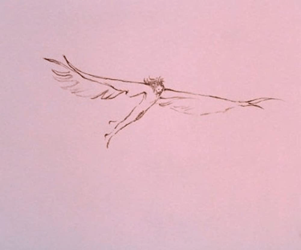In this hand-drawn, meditative short made up of naturalistic sketches, Bochner retells the classic tale of Icarus; however, he puts a unique emphasis on the idea of the body as a prison, and on the shared hybridity of the Minotaur and of the “Bird-men” that Daedalus & his son become when they don their wings. The film ends on a cosmic note, reminiscent of Phaethon, as Icarus flies beyond the atmosphere into space, only to fall.